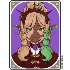 Muhit has champagne blonde hair color (I think that it-) that's goes waist length, although they're always styling it with a high bun and two bubble braids on the side of his face, one of them having a light green color. It's skin is dark with vitiligo and her eyes are dark green, he also has a mole under their mouth